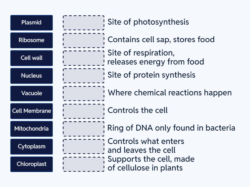 Nucleus - Controls the cell, Cytoplasm - Where chemical reactions happen, Cell Membrane - Controls what enters and leaves the cell, Mitochondria - Site of respiration, releases energy from food, Cell wall - Supports the cell, made of cellulose in plants, Chloroplast - Site of photosynthesis, Vacuole - Contains cell sap, stores food, Ribosome - Site of protein synthesis, Plasmid - Ring of DNA only found in bacteria,
