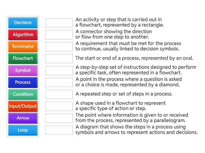 Flowchart - A diagram that shows the steps in a process using symbols and arrows to represent actions and decisions., Symbol - A shape used in a flowchart to represent a specific type of action or step., Process - An activity or step that is carried out in a flowchart, represented by a rectangle., Decision - A point in the process where a question is asked or a choice is made, represented by a diamond., Input/Output - The point where information is given to or received from the process, represented by a parallelogram., Terminator - The start or end of a process, represented by an oval., Arrow - A connector showing the direction or flow from one step to another., Loop - A repeated step or set of steps in a process., Condition - A requirement that must be met for the process to continue, usually linked to decision symbols., Algorithm - A step-by-step set of instructions designed to perform a specific task, often represented in a flowchart.,