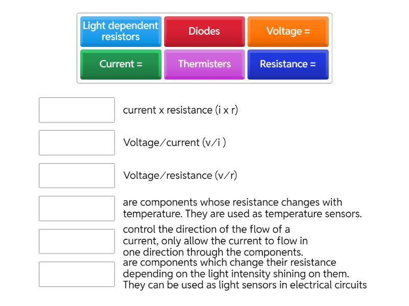 Thermisters - are components whose resistance changes with temperature. They are used as temperature sensors., Light dependent resistors (LDR) - are components which change their resistance depending on the light intensity shining on them. They can be used as light sensors in electrical circuits, Diodes - control the direction of the flow of a current, only allow the current to flow in one direction through the components., Voltage =  - current x resistance (i x r), Current = - Voltage ∕ resistance  (v ∕ r), Resistance =  - Voltage ∕ current (v ∕ i ), Resistor - a component having resistance to the passage of an electric current, Fuse - is an electrical safety device that operates to provide overcurrent protection of an electrical circuit, Light emiting resitor (LED) - is a component that emits light when current flows through it. , Variable resistor - are components used in electric circuits to adjust the value of current or voltage,