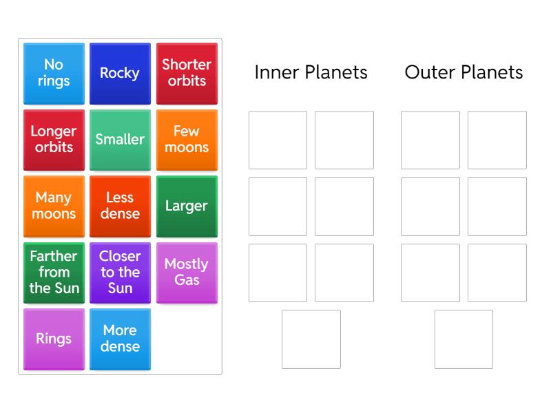 Inner Planets: Rocky, Smaller , Closer to the Sun, Few moons, Shorter orbits, No rings, More dense, Outer Planets: Mostly Gas, Larger, Farther from the Sun, Many moons, Longer orbits, Rings, Less dense,