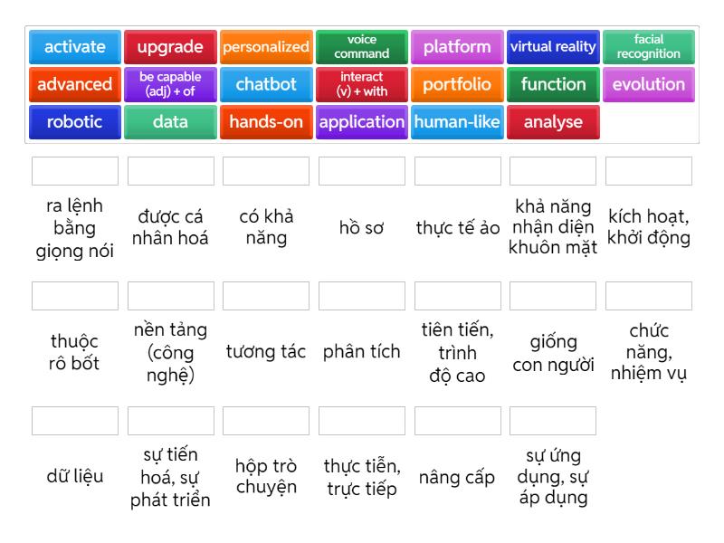 activate - kích hoạt, khởi động, advanced - tiên tiến, trình độ cao, analyse - phân tích, application - sự ứng dụng, sự áp dụng, be capable (adj) + of - có khả năng, chatbot - hộp trò chuyện, data - dữ liệu, evolution - sự tiến hoá, sự phát triển, facial recognition - khả năng nhận diện khuôn mặt, function - chức năng, nhiệm vụ, hands-on - thực tiễn, trực tiếp, human-like - giống con người, interact (v) + with - tương tác, personalized - được cá nhân hoá, platform - nền tảng (công nghệ), portfolio - hồ sơ, robotic - thuộc rô bốt, upgrade - nâng cấp, virtual reality - thực tế ảo, voice command - ra lệnh bằng giọng nói,