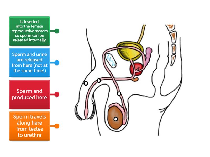 Sperm and urine are released from here (not at the same time!), Sperm and produced here, Sperm travels along here from testes to urethra, Is inserted into the female reproductive system so sperm can be released internally.
