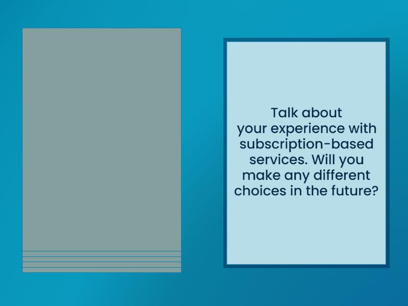 Talk about an ad that you found particularly effective or memorable. Why was it so successful?, Talk about the future of media like movies and video games. Will they all be subscriptions?, Talk about your experience with subscription-based services. Will you make any different choices in the future?, Talk about the future of advertising. Will it become more ubiquitous? Will governments control it?, Talk about your experience with small business. Are you or do you know a small business owner?, Talk about how technology is affecting business. What things are disappearing? What is emerging?.
