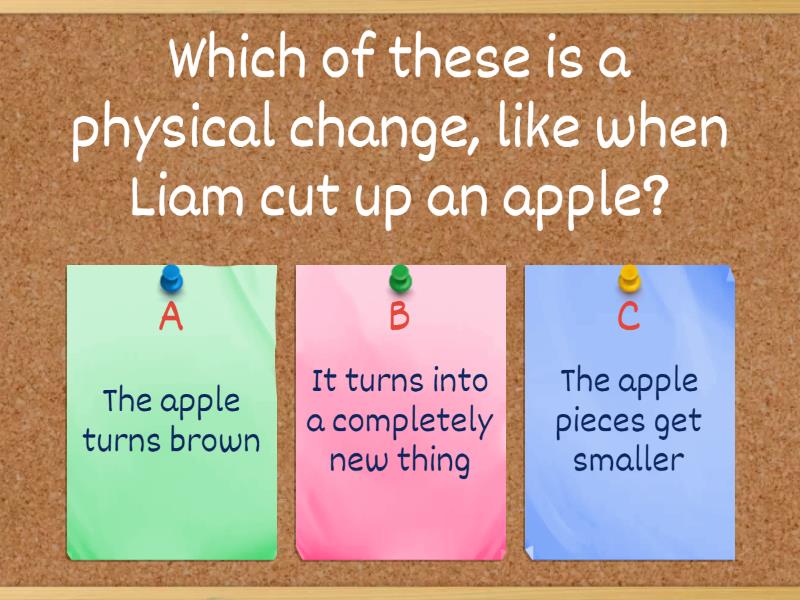 1) Which of these is a physical change, like when Liam cut up an apple? a) The apple turns brown b) It turns into a completely new thing c) The apple pieces get smaller 2) What happens when Jeremiah freeze water into an ice cube? a) The water disappears b) The water turns into a new kind of liquid c) The water changes shape 3) If Ava Grace tear a piece of paper, is that a physical change or a chemical change? a) Chemical change b) Physical change 4) Which of these is a physical change? a) Baking a cake b) Melting Butter c) A plant growing tall 5) What happens when Lauren mixes sugar in water? a) The sugar disappear b) The sugar changes color c) The sugar dissolves 6) When Isaiah blows up a balloon, what kind of change is happening? a) Chemical change b) Physical change 7) Which of these is a chemical change, like when Eligah burns a candle? a) The candle melts b) The candle gets shorter c) The candle flame produces smoke 8) If William crushes a can, what kind of change is that? a) Chemical change b) Physical change 9) What happens when Cabell mixes baking soda and vinegar? a) A new substance is created with bubbles b) The baking soda just dissolves 10) Which of these is a physical change? a) Mason's rusty bike b) A broken cookie c) A growing flower 11) When Jamie boils water, what happens? a) The water turns into steam b) The water changes color 12) Which of these is a chemical change? a) Cutting an apple b) A banana turning brown c) Folding a piece of paper 13) What happens when Annslee freezes juice? a) The juice becomes a solid b) The juice becomes a new liquid 14) Is melting ice physical or chemical change? a) Chemical change b) Physical change 15) When Bryson mixes different colors of paint together, what kind of change is that? a) Chemical change b) Physical change
