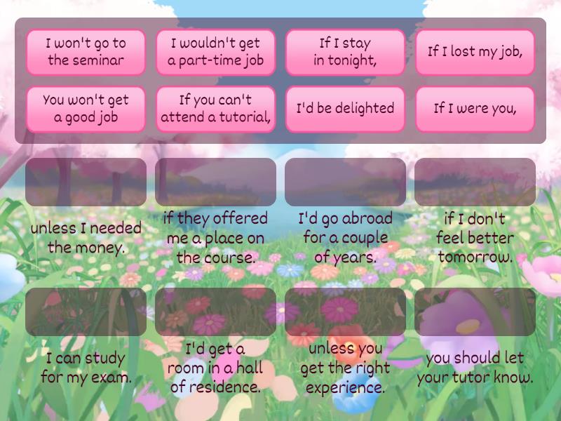 If I lost my job, - I'd go abroad for a couple of years., If I stay in tonight, - I can study for my exam., If you can't attend a tutorial, - you should let your tutor know., You won't get a good job - unless you get the right experience., I won't go to the seminar - if I don't feel better tomorrow., I'd be delighted - if they offered me a place on the course., If I were you, - I'd get a room in a hall of residence., I wouldn't get a part-time job - unless I needed the money.,