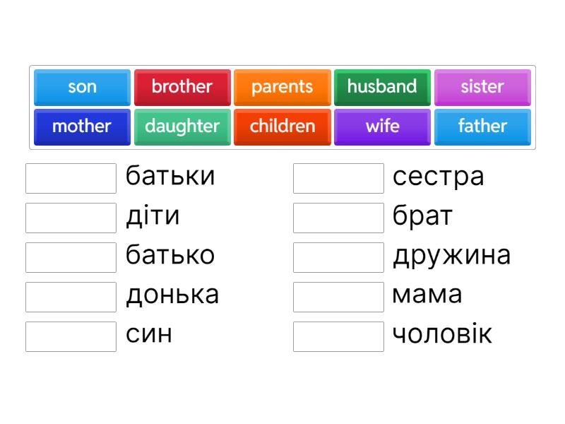 mother - мама, father - батько, daughter - донька, son - син, sister - сестра, brother - брат, wife - дружина, husband - чоловік, parents - батьки, children - діти,