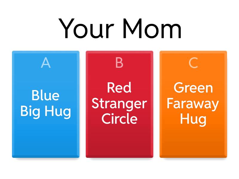 1) Your Mom a) Blue Big Hug b) Red Stranger Circle c) Green Faraway Hug 2) Your teacher a) Yellow Handshake b) Red Stranger Circle c) Blue Big Hug Circle 3) The Dentist a) Stranger Circle b) Stranger Space c) Private Purple Circle 4) The Mailman a) Stranger Space b) Stranger Circle c) Orange Wave Circle 5) Your Best Friend a) Blue Big Hug Circle b) Green Faraway Hug c) Orange Wave Circle 6) Your Aunt a) Purple Private Circle b) Blue Big Hug Circle c) Green Faraway Hug Circle 7) The School Principal a) Red Stranger Space b) Blue Big Hug Circle c) Yellow Handshake Circle 8) Your classmate a) Blue Big Hug Circle b) Yellow Handshake Circle c) Purple Private Circle 9) The person in the parking lot getting into their car a) Green Faraway Hug Circle b) Blue Big Hug Circle c) Stranger Space 10) Your dad a) Green Faraway Hug Circle b) Blue Big Hug Circle c) Stranger Circle 11) A random kid in France a) Green Far Away Circle b) Yellow Handshake Circle c) Red Stranger Space 12) A Police Officer a) Stranger Circle b) Green Faraway Hug Circle c) Blue Big Hug Circle 13) A man at the grocery store talking to you a) Stranger Space (RUN AWAY) b) Private Purple Circle c) Wave Circle 14) A child on your street a) Blue Big Hug Circle b) Stranger Circle c) Orange Wave Circle 15) A person on the phone that you don't know a) Blue Big Hug circle b) Red Stranger Space c) Yellow Handshake Circle 16) A friend from school who gave you their username & you're talking online. a) Stranger Space b) Wave Circle c) Green Faraway Hug Circle 17) A random person in a chat room who is funny and says they live in your town. a) Blue Big Hug b) Red Stranger Space c) Orange Wave Circle
