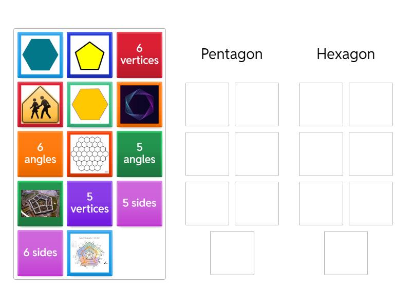Pentagon: , 5 sides, 5 angles, 5 vertices, , , , Hexagon: 6 sides, 6 angles, 6 vertices, , , , ,