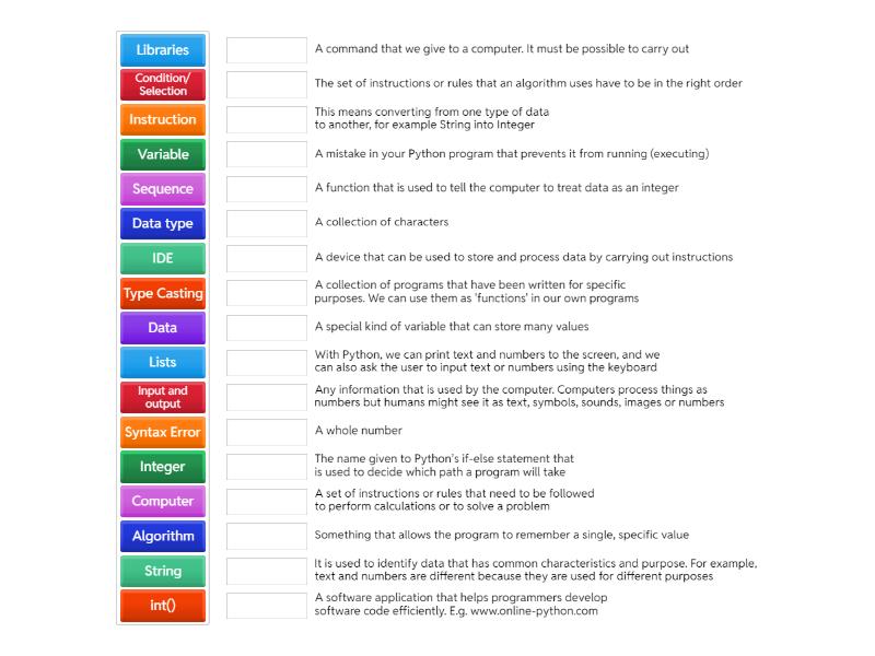 Computer - A device that can be used to store and process data by carrying out instructions, Instruction - A command that we give to a computer. It must be possible to carry out, Variable - Something that allows the program to remember a single, specific value, String - A collection of characters, Data - Any information that is used by the computer. Computers process things as numbers but humans might see it as text, symbols, sounds, images or numbers, Integer - A whole number, int() - A function that is used to tell the computer to treat data as an integer, Type Casting - This means converting from one type of data to another, for example String into Integer, Algorithm - A set of instructions or rules that need to be followed to perform calculations or to solve a problem, Sequence - The set of instructions or rules that an algorithm uses have to be in the right order, Data type - It is used to identify data that has common characteristics and purpose. For example, text and numbers are different because they are used for different purposes, Syntax Error - A mistake in your Python program that prevents it from running (executing), Input and output - With Python, we can print text and numbers to the screen, and we can also ask the user to input text or numbers using the keyboard, Condition/ Selection - The name given to Python’s if-else statement that is used to decide which path a program will take, IDE - A software application that helps programmers develop software code efficiently. E.g. www.online-python.com, Libraries - A collection of programs that have been written for specific purposes. We can use them as 'functions' in our own programs, Lists - A special kind of variable that can store many values,