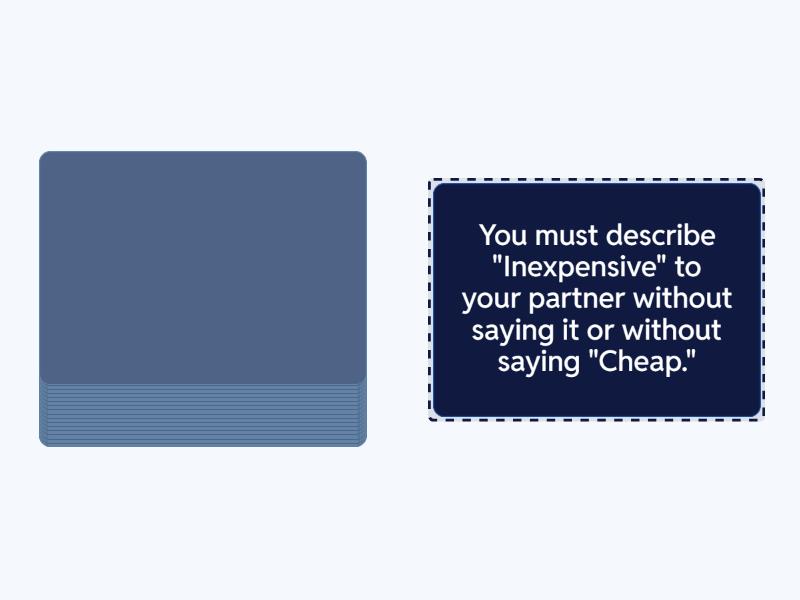 You must describe "Somewhat" to your partner without saying it or without saying "A little.", You must describe "Concerning" to your partner without saying it or without saying "About.", You must describe "Consistently" to your partner without saying it or without saying "Always.", You must describe "Inquire" to your partner without saying it or without saying "Ask.", You must describe "Negative" or "Detrimental" to your partner without saying it or without saying "Bad.", You must describe "Commence" to your partner without saying it or without saying "Begin" or "Start.", You must describe "Large" or "Significant" to your partner without saying it or without saying "Big.", You must describe "Courageous" to your partner without saying it or without saying "Brave.", You must describe "Inexpensive" to your partner without saying it or without saying "Cheap.", You must describe "Verify" to your partner without saying it or without saying "Check.", You must describe "Terminate" or "Conclude" to your partner without saying it or without saying "End.", You must describe "Rapid" to your partner without saying it or without saying "Fast.", You must describe "Repair" to your partner without saying it or without saying "Fix.", You must describe "Obtain" or "Receive" to your partner without saying it or without saying "Get.", You must describe "Provide" to your partner without saying it or without saying "Give.", You must describe "Positive" or "Beneficial" to your partner without saying it or without saying "Good.", You must describe "Pleased" or "Content" to your partner without saying it or without saying "Happy.", You must describe "Assist" to your partner without saying it or without saying "Help.", You must describe "Famished" to your partner without saying it or without saying "Hungry.", You must describe "Concept" to your partner without saying it or without saying "Idea.", You must describe "Significant" or "Crucial" to your partner without saying it or without saying "Important.", You must describe "Occupation" or "Profession" to your partner without saying it or without saying "Job.", You must describe "Retain" to your partner without saying it or without saying "Keep.", You must describe "Depart" to your partner without saying it or without saying "Leave.", You must describe "Examine" to your partner without saying it or without saying "Look at.", You must describe "Ensure" to your partner without saying it or without saying "Make sure.", You must describe "Perhaps" to your partner without saying it or without saying "Maybe.", You must describe "Predominantly" to your partner without saying it or without saying "Mostly.", You must describe "Require" to your partner without saying it or without saying "Need.", You must describe "Frequently" to your partner without saying it or without saying "Often.", You must describe "Aged" or "Elderly" to your partner without saying it or without saying "Old.", You must describe "Tolerate" to your partner without saying it or without saying "Put up with.", You must describe "Wealthy" to your partner without saying it or without saying "Rich.", You must describe "Correct" to your partner without saying it or without saying "Right.", You must describe "Unhappy" or "Sorrowful" to your partner without saying it or without saying "Sad.", You must describe "State" or "Express" to your partner without saying it or without saying "Say.", You must describe "Frightened" or "Terrified" to your partner without saying it or without saying "Scared.", You must describe "Demonstrate" or "Illustrate" to your partner without saying it or without saying "Show.", You must describe "Delayed" or "Gradual" to your partner without saying it or without saying "Slow.", You must describe "Discuss" to your partner without saying it or without saying "Talk about.", You must describe "Consider" to your partner without saying it or without saying "Think about.", You must describe "Fatigued" or "Exhausted" to your partner without saying it or without saying "Tired.", You must describe "Attempt" to your partner without saying it or without saying "Try.", You must describe "Utilize" to your partner without saying it or without saying "Use.", You must describe "Extremely" to your partner without saying it or without saying "Very.", You must describe "Entire" to your partner without saying it or without saying "Whole.", You must describe "Concerned" to your partner without saying it or without saying "Worried.", You must describe "Incorrect" to your partner without saying it or without saying "Wrong.", You must describe "Youthful" to your partner without saying it or without saying "Young.".