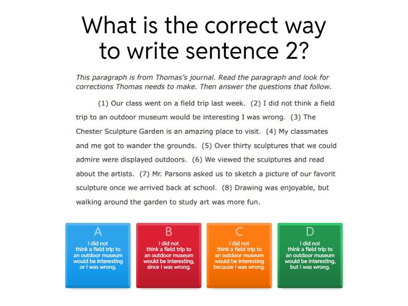 1) What is the correct way to write sentence 2? a) I did not think a field trip to an outdoor museum would be interesting or I was wrong. b) I did not think a field trip to an outdoor museum would be interesting, since I was wrong. c) I did not think a field trip to an outdoor museum would be interesting because I was wrong. d) I did not think a field trip to an outdoor museum would be interesting, but I was wrong. 2) What change should be made in sentence 4? a) Change classmates to classmate’s b) Change me to I c) Change got to gets d) Change wander to wunder 3) What change should be made in sentence 7? a) Change asked to asks b) Change picture to pictures c) Change favorit to favorite d) Change arrived to arrive 4) What change should be made in sentence 3? a) Change It to They b) Change weather to whether c) Delete the comma after predictions d) Change calandar to calendar 5) What change should be made in sentence 6? a) Change However to Meanwhile b) Change believed to believe c) Change usefuller to more useful d) Change than to then 6) What change should be made in sentence 8? a) Change Even to Evan b) Change french to French c) Change of to with d) Change book to books