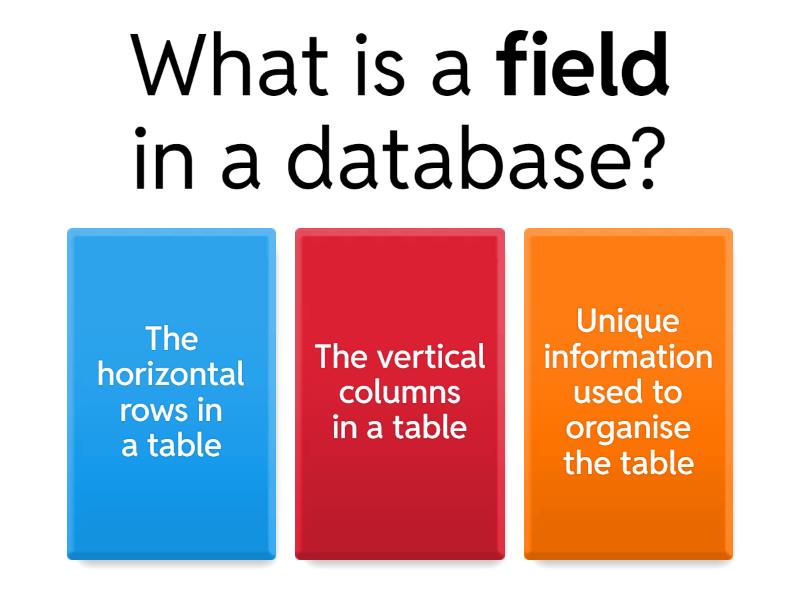 1) What is a field in a database? a) The horizontal rows in a table b) The vertical columns in a table c) Unique information used to organise the table 2) What is a record in a database? a) The horizontal rows in a table b) The vertical columns in a table c) Unique information used to organise the table 3) What is a primary key in a database? a) The horizontal rows in a table b) The vertical columns in a table c) Unique information used to organise the table 4) Should a primary key ever be changed? a) Yes b) No 5) Can two records have the same primary key? a) Yes b) No 6) Which is NOT an example of a database a) Movies on Netflix or Disney+ b) Songs on Spotify or iTunes c) Products on Amazon d) A single name