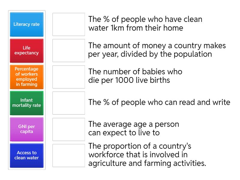 GNI per capita - The amount of money a country makes per year, divided by the population, Literacy rate - The % of people who can read and write, Access to clean water - The % of people who have clean water 1km from their home, Infant mortality rate - The number of babies who die per 1000 live births, Percentage of workers employed in farming - The proportion of a country's workforce that is involved in agriculture and farming activities.​, Life expectancy - The average age a person can expect to live to,