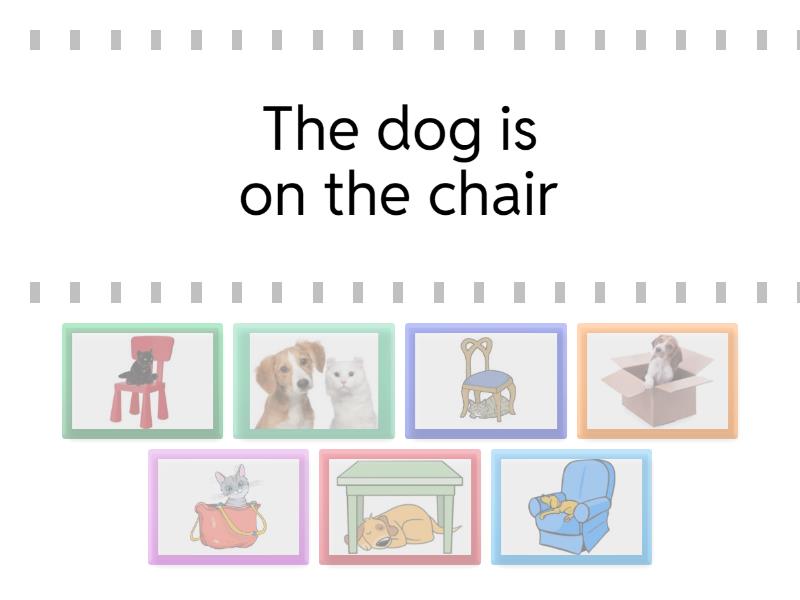 The dog is on the chair, The dog is under the table, The dog is in the box, The cat is on the chair, The cat is in the bag, The cat is under the chair, The cat is next to the dog,