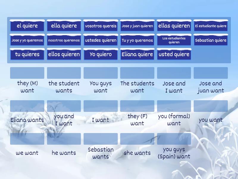 Yo quiero - I want, tu quieres - you want, el quiere - he wants, ella quiere - she wants, usted quiere - you (formal) want, nosotros queremos - we want, vosotros quereis - you guys (Spain) want, ellos quieren - they (M) want, ellas quieren - they (F) want, ustedes quieren - You guys want, Jose y juan quieren - Jose and juan want, Jose y yo queremos - Jose and I want, Los estudiantes quieren - The students want, El estudiante quiere - the student wants, Tu y yo queremos - you and I want, Sebastian quiere - Sebastian wants, Eliana quiere - Eliana wants,