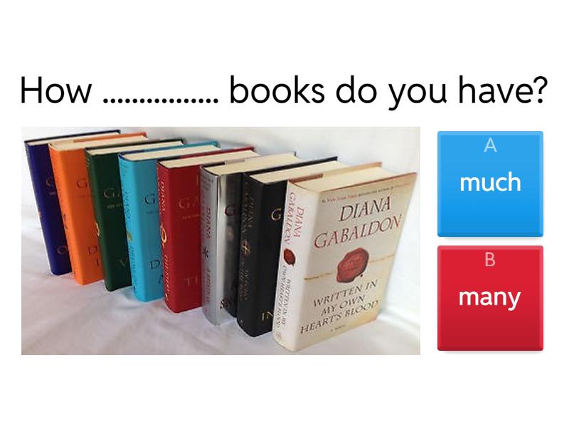 1) How ................ books do you have? a) much b) many 2) There are ............ apples on the table. a) any b) some 3) Is there ..................sugar in your tea? a) some b) any 4) I have got ................... money in my wallet. a) a little b) a few 5) Have you got ......... time to help me? a) some b) any 6) Do you have ........... ideas? a) any b) some 7) How .............. free time do you have? a) much b) many 8) I have got only ............... friends. a) a little b) a few 9) There isn't ............. chesse left. a) some b) any 10) A have got .................. homework today. a) lot b) a lot of 11) I don't drink ................ water. a) many b) a lot of 12) Are there .............. oranges on the shelf? a) some b) any 13) There is .................. flour in the biscuit. It doesn't make you fat. a) a lot of b) a little 14) How ............... is this T-shirt? a) many b) much 15) We need ............ eggs for this cake. a) a few b) a little