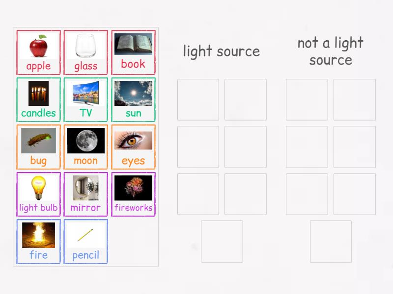 light source: light bulb, bug, fire, fireworks, TV, candles, sun, not a light source: mirror, book, apple, eyes, pencil, glass, moon,