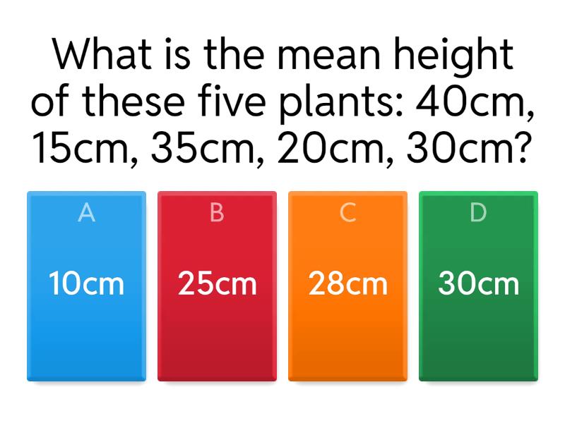 1) What is the mean height of these five plants: 40cm, 15cm, 35cm, 20cm, 30cm? a) 10cm b) 25cm c) 28cm d) 30cm 2) What is the range weight of five dogs that weigh: 14kg, 9kg, 30kg, 16kg, 8kg? a) 6kg b) 22kg c) 11kg d) 15.4kg 3) Six students try to complete a puzzle, the scores are below. What is the mean time taken to complete the puzzle? a) 10 b) 16.8 c) 8.4 d) 14 4) Here are the ages of some workers. What is the range of their ages? a) 39 b) 6 c) 34 d) 50 5) The time taken for four colleagues to complete a crossword are: 12 minutes, 600 seconds, half an hour, 25 minutes. What is the mean time it takes them? a) 77 minutes b) 4620 seconds c) 19 minutes and 15 seconds d) 19 minutes and 25 seconds 6) The time taken for four colleagues to complete a crossword are: 12 minutes, 600 seconds, half an hour, 25 minutes. What is the mean time it takes them? a) 13 minutes b) 20 minutes c) 19 minutes d) 780 seconds