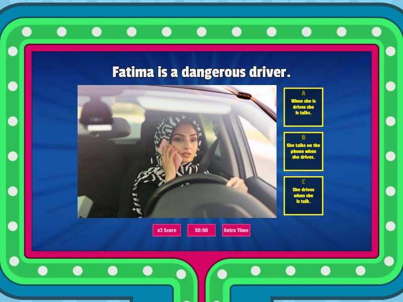 1) Fatima is a dangerous driver. a) When she is drives she is talks. b) She talks on the phone when she drives. c) She drives when she is talk. 2) They are tired. a) They drink coffee when they wake up early. b) When waking they are coffee drinking. c) Coffee drinking when they are wake up and chat. 3) Nolvia is a careful person. a) She makes dinner when she is careful cuts. b) Careful she cuts when the dinner makes. c) She is careful when she makes dinner. 4) Elizabeth works at Walmart. a) She uniform wears when is at work wearing it. b) She wears a uniform when she is at work. c) She is work uniform wearing when she is at work. 5) Saffiya writes many emails at work. a) Saffiya is a computer using for emails when she is work. b) Saffiya is writes emails when she works is. c) Saffiya uses a computer when she writes emails. 6) Keres is a chef. a) She wears gloves when she bakes. b) She bakes when she is glove wears. c) She is bakes when gloves wearing. 7) Sonia is a happy person. a) She is happy when smiles. b) She smiling when happy. c) She smiles when she is happy. 8) Vika is a busy person. a) When she is tired, she doesn't feel good. b) When she tired is does not good feel. c) When she is tired, she is not feels good. 9) Oscar is a hard worker. a) Oscar no relax at when he is work. b) Oscar doesn't relax when he is at work. c) Oscar when at work no relax. 10) Luis loves his family. a) He doesn't feel sad when he family time spending. b) He spending doesn't feel sad when with family. c) He doesn't feel sad when he spends time with his family.