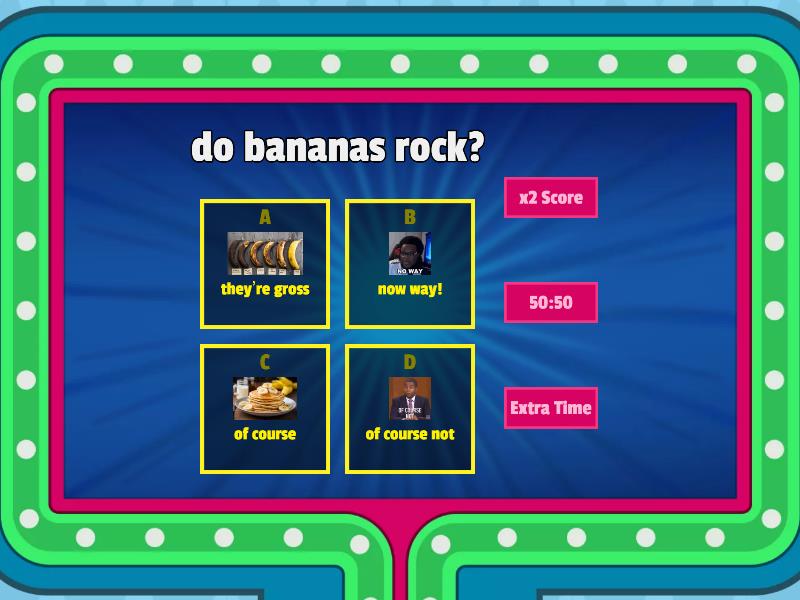 1) do bananas rock? a) they’re gross b) now way! c) of course  d) of course not 2) what is a bananas favorite color? a) blue b) yellow c) orange d) red 3) is eating a banana illegal? a) no b) yes c) of course not d) no! I eat bananas all the time