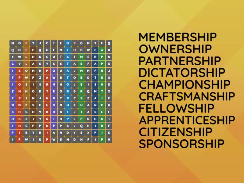 membership, ownership, partnership, dictatorship, championship, craftsmanship, fellowship, apprenticeship, citizenship, sponsorship,
