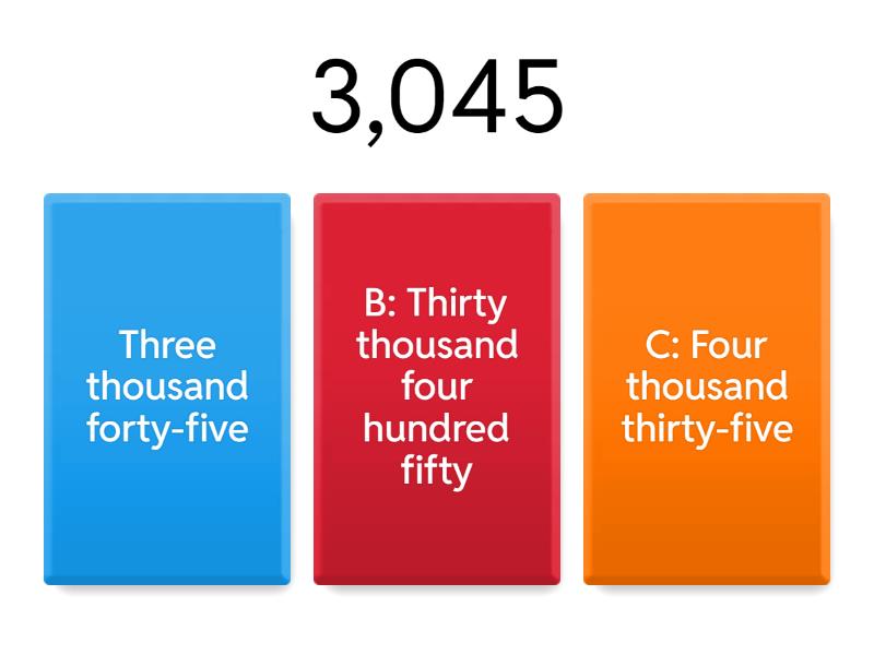 1) 3,045 a) Three thousand forty-five b) B: Thirty thousand four hundred fifty c) C: Four thousand thirty-five 2) 789 a) A: Seven hundred eighty-nine b) B: Eight hundred seventy-nine c) C: Six hundred seventy-nine 3) 1,234 a) One thousand two hundred forty-three b) One thousand two hundred thirty-four c) One thousand two hundred fifty-three 4) 76 a) Seventy-five b) Seventy c) Seventy-six 5) 999 a) Nine thousand nine hundred b) Nine hundred ninety-nine c) Nine hundred 6) 42,000 a) Four hundred two thousand b) Forty-two hundred c) Forty-two thousand 7) 600,123 a) : Six hundred one thousand two hundred thirty b) : Six hundred thousand one hundred twenty-three c) Six hundred thousand two hundred thirty