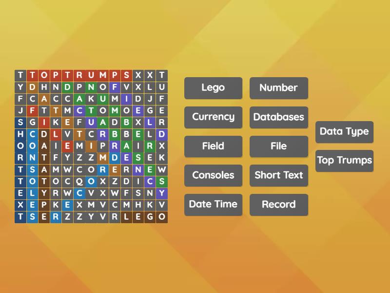Databases - Databases, Field - Field, File - File, Record - Record, Data Type - Data Type, Short Text - Short Text, DateTime - Date Time, Number - Number, Currency - Currency, Top Trumps - Top Trumps, Consoles - Consoles, Lego - Lego,
