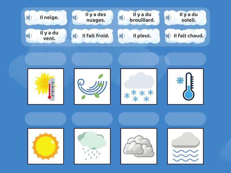 Il y a du soleil., Il fait chaud., Il fait froid., Il y a du vent., Il pleut., Il neige., Il y a du brouillard., Il y a des nuages.,