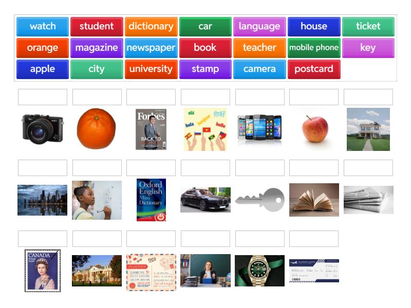teacher, stamp, book, apple, key, mobile phone, newspaper, watch, camera, orange, ticket, magazine, dictionary, house, car, postcard, student, city, university, language ,