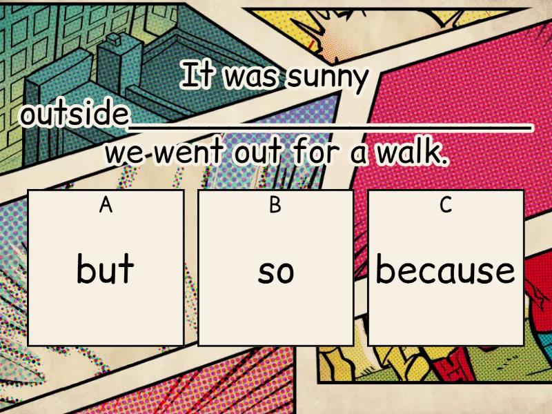 1) I did my homework________________ I am a fantastic student. a) because b) or c) but 2) It was sunny outside____________________ we went out for a walk. a) but b) so c) because 3) I was late __________________ the bus didn't come. a) and b) but c) because 4) I went to the shop____________________ bought some chicken for dinner.  a) and b) because c) so 5) I opened the door __________________ the postman knocked it. a) but b) and c) because 6) Ahmed ran fast __________________ he still missed his train.  a) but b) because c) so 7) My friend was very happy yesterday _______________ it was her birthday . a) as b) so c) and 8) I like apples _____________________ I don't like oranges. a) but b) because c) and 9) We could go to Cardiff ______ we could go to Bristol.  a) so b) or c) but 10) I didn't have breakfast _____________ I am hungry now. a) because b) or c) so 11) We could visit my sister on Saturday morning ______ we could go shopping first. a) or b) because c) as 12) I had a busy day, ____________I was tired in the evening.  a) so b) because c) but 13) The children played cricket ___________ they went swimming. a) so b) as c) and 14) I went to the bank _______ it was closed when I arrived.  a) but b) because c) so 15) It was too hot ___________ I opened the window. a) but b) because c) so