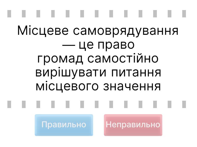 Правильно: Місцеве самоврядування — це право громад самостійно вирішувати питання місцевого значення, Місцеві ради обираються мешканцями громади., Виконавчі органи місцевого самоврядування формуються сільськими, селищними та міськими головами., Громадяни можуть брати участь у місцевому самоврядуванні через громадські слухання., Місцеве самоврядування має право управляти комунальною власністю., Основним завданням місцевого самоврядування є забезпечення потреб місцевих жителів., Прозорість роботи місцевого самоврядування забезпечується публічністю рішень., Місцеве самоврядування відповідає за стан доріг у громаді., Місцеве самоврядування сприяє розвитку освіти, культури та спорту в громаді., Законодавчим актом, який регулює діяльність місцевого самоврядування, є Конституція України., Громадяни можуть оскаржити рішення місцевої ради в суді., Місцеве самоврядування має право залучати інвестиції для розвитку громади, Неправильно: Місцеве самоврядування є підпорядкованим центральній владі у всіх питаннях., Місцеві бюджети формуються виключно за рахунок державних дотацій., Сільський, селищний або міський голова обирається на строк 7 років., Голови громад затверджують закони України., Місцеві ради не мають права встановлювати місцеві податки та збори., Органи місцевого самоврядування приймають рішення лише з дозволу Верховної Ради України., Місцеве самоврядування не має повноважень у сфері охорони здоров'я., Участь мешканців у місцевих виборах є обов’язковою.,