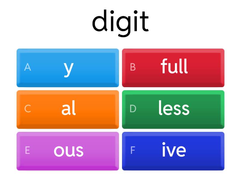 1) digit a) y b) full c) al d) less e) ous f) ive 2) patriot a) ic b) y c) full d) less e) ous f) ive 3) dead a) full b) ly c) less d) y e) ous f) ive 4) meaning a) full b) y c) ous d) less e) ive f) ic 5) option a) al b) less c) y d) full e) ous f) ive 6) life a) ous b) full c) less d) y e) ive f) ic 7) anger a) ive b) y c) ous d) full e) less f) ic 8) Rome a) less b) y c) full d) an e) ous f) ive 9) problem a) full b) ic c) less d) y e) ous f) ive 10) type a) less b) y c) full d) ical e) ive f) able 11) knowledge a) able b) less c) full d) y e) ous f) ive 12) mountain a) y b) full c) ous d) less e) ive f) able 13) horror a) full b) less c) y d) ible e) ous f) ive 14) represent a) y b) ive c) full d) less e) ous f) able 15) luxury a) full b) ous c) less d) y e) ive f) able 16) support a) less b) ive c) full d) y e) ous f) able 17) faith a) y b) less c) ful d) ous e) ive f) able 18) change a) able b) less c) y d) full e) ous f) ive 19) danger a) ous b) full c) y d) less e) ive f) an 20) comfort a) y b) able c) less d) full e) ous f) ive 21) industry a) less b) y c) full d) ial e) ous f) ive 22) fame a) y b) less c) ous d) full e) ive f) an 23) music a) full b) ous c) al d) y e) less f) ive 24) fog a) ous b) less c) y d) full e) ive f) an 25) economy a) y b) full c) less d) ical e) ous f) ive 26) centre a) al b) less c) full d) y e) ous f) ive