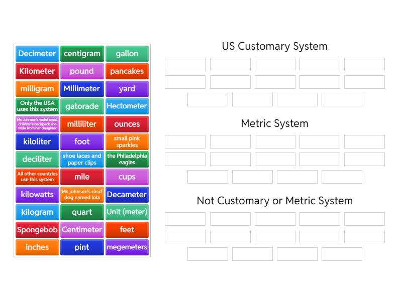 US Customary System: inches, foot, feet, yard, mile, Only the USA uses this system, pound, ounces, gallon, quart, pint, cups, Metric System: Kilometer, Hectometer, Decameter, Unit (meter), Decimeter, Centimeter, Miliimeter, All other countries use this system, deciliter, milliliter , kiloliter, kilogram, milligram, centigram, Not Customary or Metric System : gatorade, megemeters, kilowatts, shoe laces and paper clips, pancakes, Ms johnson's deaf dog named lola , Spongebob, small pink sparkles , the Philadelphia eagles , Ms Johnson's weird small children's backpack she stole from her daughter ,