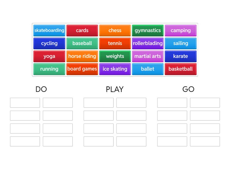 DO: ballet, karate, gymnastics, martial arts, weights, yoga, PLAY: basketball, board games, cards, chess, tennis, baseball , GO: camping, cycling, horse riding, ice skating, rollerblading, running, skateboarding, sailing,