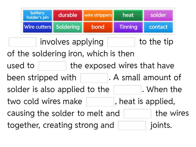 ____ involves applying ____ to the tip of the soldering iron, which is then used to ____ the exposed wires that have been stripped with ____. A small amount of solder is also applied to the ____. When the two cold wires make ____, heat is applied, causing the solder to melt and ____ the wires together, creating strong and ____ joints.