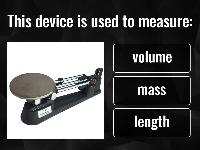 1) This device is used to measure: a) volume b) mass c) length 2) This device is used to measure: a) volume b) mass c) length 3) This device is used to measure: a) volume b) mass c) length 4) When using this device, the unit of measure is: a) meters b) liters c) grams 5) When using this device, the unit of measure is: a) meters b) liters c) grams 6) When using this device, the unit of measure is: a) meters b) liters c) grams 7) Liters measure: a) distance b) volume c) mass 8) Grams measure: a) distance b) volume c) mass 9) Meters measure: a) distance b) volume c) mass 10) Mass is the amount of: a) volume in an object. b) stuff (matter) in an object c) space an object takes up d) newtons in an object 11) Volume is the amount of: a) volume in an object. b) stuff (matter) in an object c) space an object takes up d) newtons in an object 12) Complete the following metric conversion: 500mg = ____________ cg a) 5 b) .05 c) 50 d) 5000 13) Complete the following metric conversion: 6km = ____________ m a) 6 b) .06 c) 60 d) 6000 14) Complete the following metric conversion: 9ml = ____________ hl a) .009 b) 90,000 c) 900 d) .00009 15) Complete the following metric conversion: 5.2m = ____________ mm a) 5,200 b) .0052 c) 52 d) 520 16) What is the mass of the object? a) 7.3g b) 30.3g c) 37.3g d) 100.3g 17) What is the mass of the object? a) 536mg b) 536.8g c) 536g d) 536.8mg 18) What is the mass of the object? a) 263L b) 263.5ml c) 263g d) 263.5g 19) Using your knowledge of water displacement, what is the volume of the solid object? a) 10.5 ml b) 11.5L c) 10.5cm3 d) 11.5cm3 20) Using your knowledge of water displacement, what is the volume of the solid objects? a) 6 ml b) 2ml c) 2cm3 d) 6cm3
