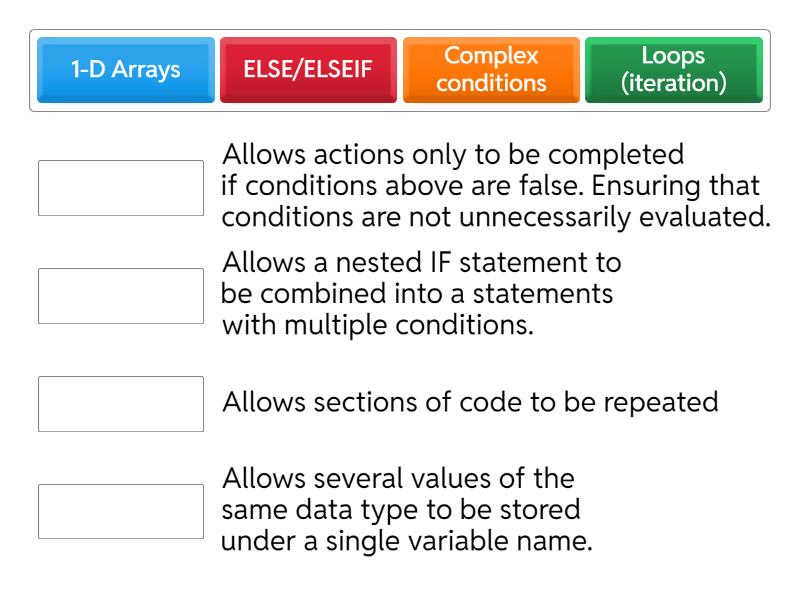 1-D Arrays - Allows several values of the same data type to be stored under a single variable name. , Loops (iteration) - Allows sections of code to be repeated, ELSE/ELSEIF - Allows actions only to be completed if conditions above are false. Ensuring that conditions are not unnecessarily evaluated., Complex conditions - Allows a nested IF statement to be combined into a statements with multiple conditions. ,