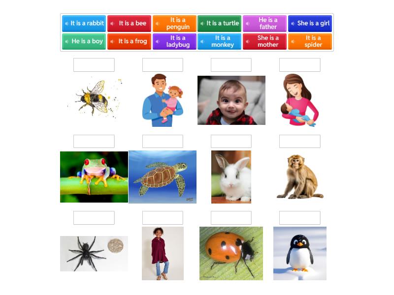 She is a girl, He is a boy, It is a turtle, It is a ladybug, It is a penguin, It is a spider, It is a monkey, It is a bee, It is a frog, It is a rabbit, She is a mother, He is a father,