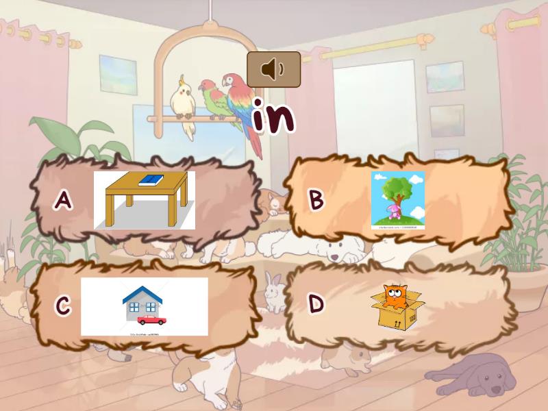 1) in a) b) c) d) 2) on a) b) c) d) 3) under a) b) c) d) 4) next to a) b) c) d) 5) behind a) b) c) d)