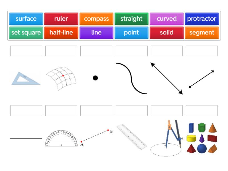 compass, ruler, set square, protractor, point, line, curved, straight, surface, solid, half-line, segment,