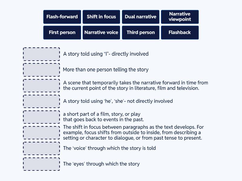 Narrative voice - The ‘voice’ through which the story is told, Third person - A story told using ‘he’, ‘she’- not directly involved, First person - A story told using “I”- directly involved, Narrative viewpoint - The ‘eyes’ through which the story, Dual narrative - More than one person telling the story, Flashback - a short part of a film, story, or play that goes back to events in the past. , Flash-forward - A scene that temporarily takes the narrative forward in time from the current point of the story in literature, film and television., Shift in focus - The shift in focus between paragraphs as the text develops. For example, focus shifts from outside to inside, from describing a setting or character to dialogue, or from past tense to present.,