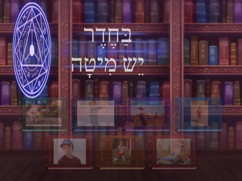 בַּחֶדֶר יֵש מִיטָה, הַקוֹף אוֹכֵל בַּנָנָה, הַיֶלֶד מְשַׂחֵק כַּדוּרֶגֶל, הַיֶלֶד לוֹבֵש פִּיזָ'מָה, הַיַלְדָה רָצָה, הַצִיפּוֹר עַל הַגַג, הַכּוֹבַע עַל הָרֹאשׁ,