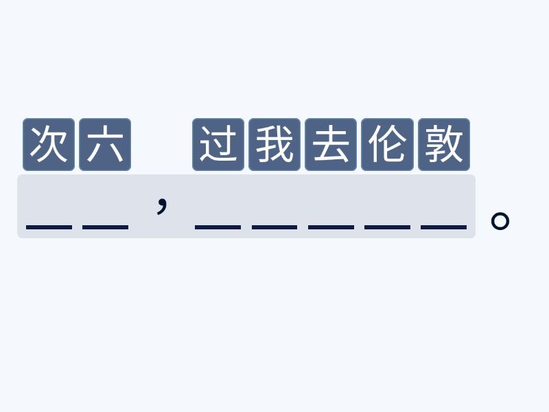 伦敦,我去过六次。, 他已经去过那儿三次。, 妈妈等了我一个晚上。, 这个电影,他已经看过两次。, 老师一个星期没看见他了。, 弟弟一天没吃饭了。, 我要在家里休息三天。, 这本书,我在学校看了一次。, 哥哥汉语已经学了六年了。, 他每天跑一个小时的步。, 医生量了十分钟我的体温。, 我昨天半个小时没上网。, 你们学多长时间汉语?,