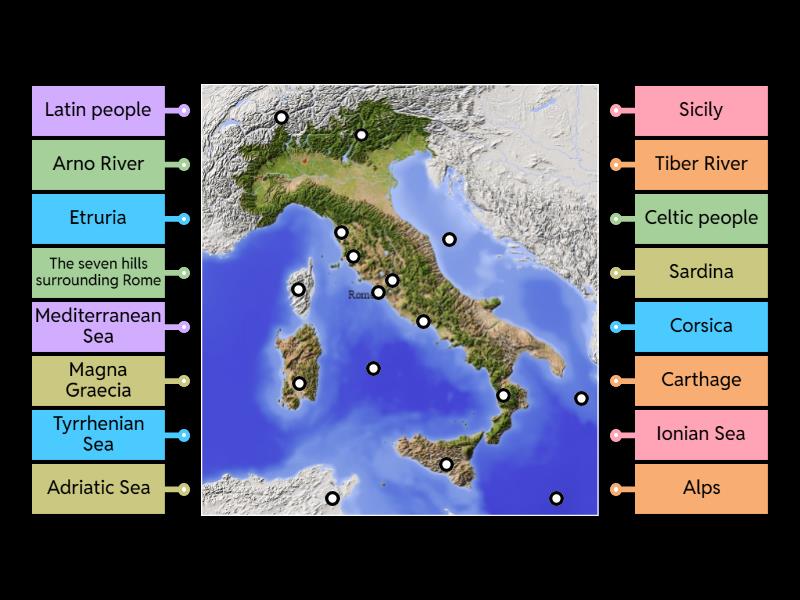 Tiber River, The seven hills surrounding Rome, Tyrrhenian Sea, Adriatic Sea, Ionian Sea, Mediterranean Sea, Alps, Celtic people, Etruria, Magna Graecia, Sicily, Latin people, Carthage, Arno River, Corsica, Sardina.