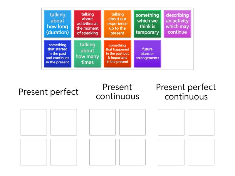 Present perfect: something that started in the past and continues in the present, talking about our experience up to the present, something that happened in the past but is important in the present, talking about how many times, Present continuous: talking about activities at the moment of speaking, future plans or arrangements, something which we think is temporary, Present perfect continuous: describing an activity which may continue, talking about how long (duration),