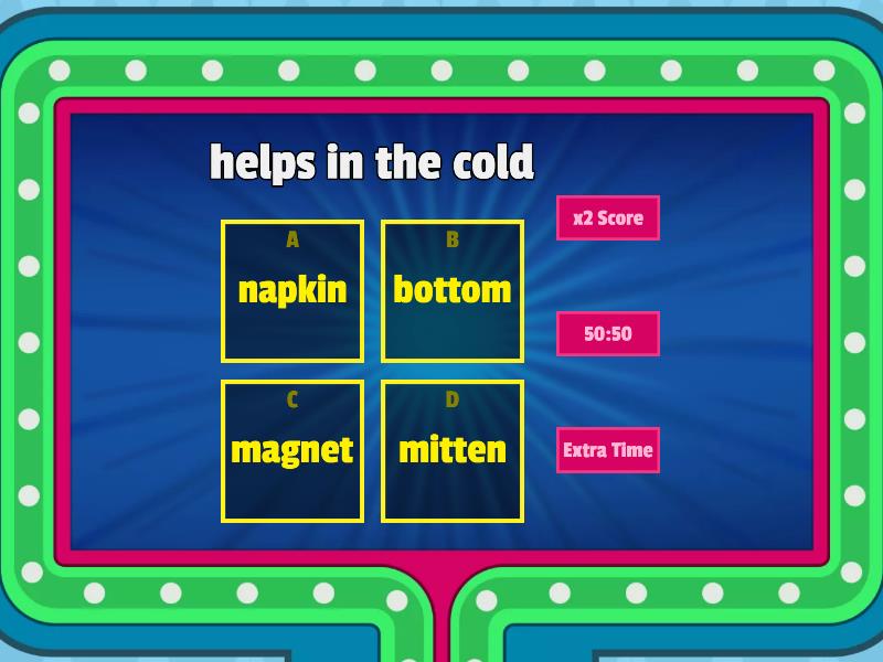 1) helps in the cold a) napkin b) bottom c) magnet d) mitten 2) hops and can drop eggs a) supper b) puppy c) kitten d) rabbit 3) a baby cat a) magnet b) bandit c) napkin d) kitten 4) holds your pants closed a) puppet b) rabbit c) button d) bandit 5) a doll on strings a) napkin b) bottom c) puppet d) magnet 6) a baby dog a) kitten b) puppy c) bottom d) supper 7) another word for dinner a) supper b) bottom c) napkin d) magnet 8) not the top a) puppet b) puppy c) kitten d) bottom