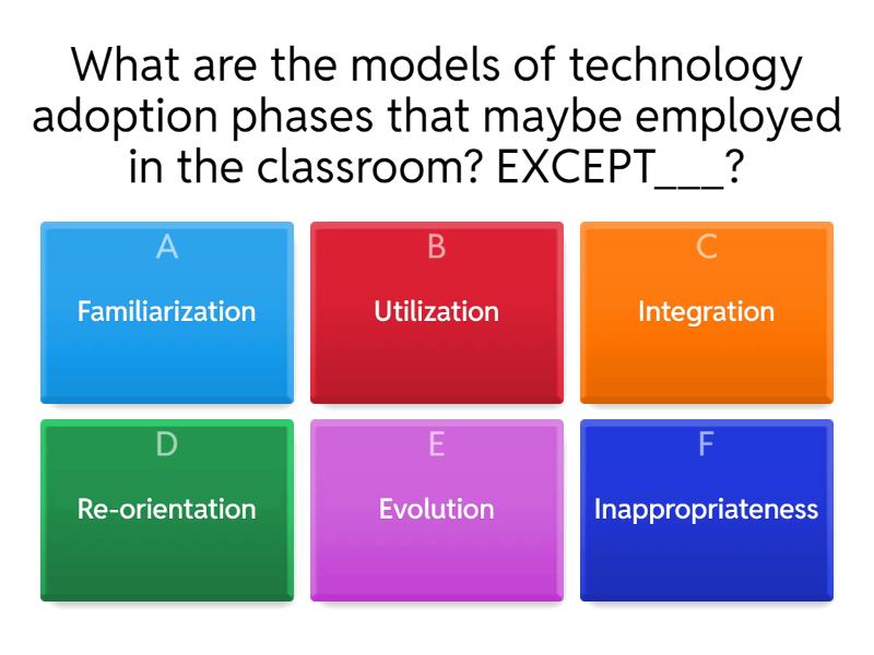 1) What are the models of technology adoption phases that maybe employed in the classroom? EXCEPT___? a) Familiarization b) Utilization c) Integration d) Re-orientation e) Evolution f) Inappropriateness 2) What is the phases in the proposed model for technology adoption based on empirical investigation by Toledo (2005).? EXCEPT_____? a) Pre-integration b) Transition c) Development d) Expansion e) System wide integration f) Non-interactive 3) What are the reasons why technology should be implemented in the classroom? EXCEPT _____? a) Technology will help students in the future career especially those who need wireless technology. b) Technology addresses diversity in learning styles. c) Technology keeps students engaged. d) Technology gives students the change to interact. e) Technology helps teachers prepare students for the real-world environment. f) Technology should teach students to be all be passive learners 4) What are phases in the USE of ICT in Education? EXCEPT______? a) Emerging b) Applying c) Infusing d) Transforming e) Draining 5) What are the ASPECTS in the transforming phase as describe in a student-centered curriculum using technology? EXCEPT _____? a) Active b) Collaborative c) Creative d) Integrative e) Evaluative f) Uninmaginative 6) In models of Technology Adoption, It refers to teacher’s initial encounter with technology? Teachers first experience with technology through trainings. a) Familiarization b) Utilization c) Integration d) Re-orientation 7) In Models of Technology Adoption what refers to stage when teachers try out the technology in the classroom? a) Familiarization b) Utilization c) Integration d) Re-orientation 8) In Models of Technology Integration what refers to constant and conscious use of technology in the classroom or in the absence would impede instruction? a) Familiarization b) Utilization c) Integration d) Re-orientation 9) In Models of Technology Integration what is the phase where teachers re-think about and reflect on their classroom practices and the purpose of the classroom and channel their attention from teacher-centered to student-centered learning? a) Re-orientation b) Evolution c) Utilization d) Integration 10) In Models of Technology Integration what is the phase where the educational system as a whole and educational technology in particular evolves or changes for it is to become relevant and effective? a) Re-orientation b) Evolution c) Utilization d) Integration