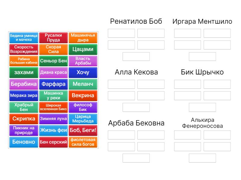 Ренатилов Боб : Хочу, Машинка у реки, Бедина умница и мачеха , Боб, Беги!, Широкая вселенная Бико, Иргара Ментшило: Фарфара, Векрина, Зимняя луна, Машинячья дыра, Скрипка, Алла Кекова: Беновно, Жизнь феи, Мерака зира, Скорость Возрождения , Царица Мерьбеда, Бик Шрычко: философ Бик, Диана краса, Рабина большая кабина, захами , Цацами, Арбаба Бековна: Берабина, Скорая Сила, Храбрый Бен, Власть Арбабы, фиолетовая сила богов, Алькира Фенероносова: Пикник на природе , Русалки Пруда , Сеньор Бен, Меланч, Бен серский ,