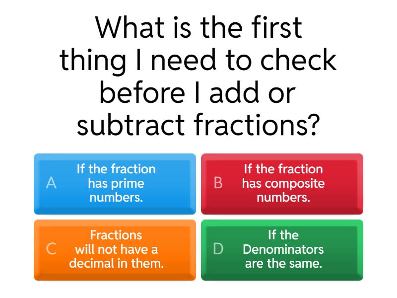 1) What is the first thing I need to check before I add or subtract fractions? a) If the fraction has prime numbers. b) If the fraction has composite numbers. c) If the Denominators are the same. d) Fractions will not have a decimal in them.