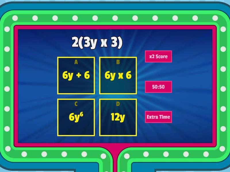 1) 2(3y x 3) a) 6y + 6 b) 6y x 6 c) 6y6 d) 12y 2) How do you "share" using distributive property? a) multiply the outside number and inside numbers like this: 4(3y x 2) 4x3y then 4x2 b) multiply the outside and inside numbers all together, like this: 2(3y x 3) 3y x 3= 9y x 2 3) FREE QUESTION! a) YAY!!!! b) not this one its wrong don't click on me haha don't click me I'm serious wait NO DONT FR DONT CLICK ME AGHHHHHHHHHHH 4) 6(11y x 6) a) 66 +6 b) 66 + 36 c) 321y7 d) 66y x 36 5) 4(4y x 8) a) 32 + 16y b) 32 x 16y c) 44 +48y d) 32 6) FILL IN THE BLANK: _(4y x 2) = 12y x 6 a) 2 b) 3 c) 6 d) 4 7) A little Timmy has 7 bananas, and gets y more; how many does he have? a) banan b) 7 + y c) 10 d) 7 x y e) 14 f) 7y 8) 5(3x - 2) a) 1510 b) 15x x 10 c) 15-10 d) 15x - 10